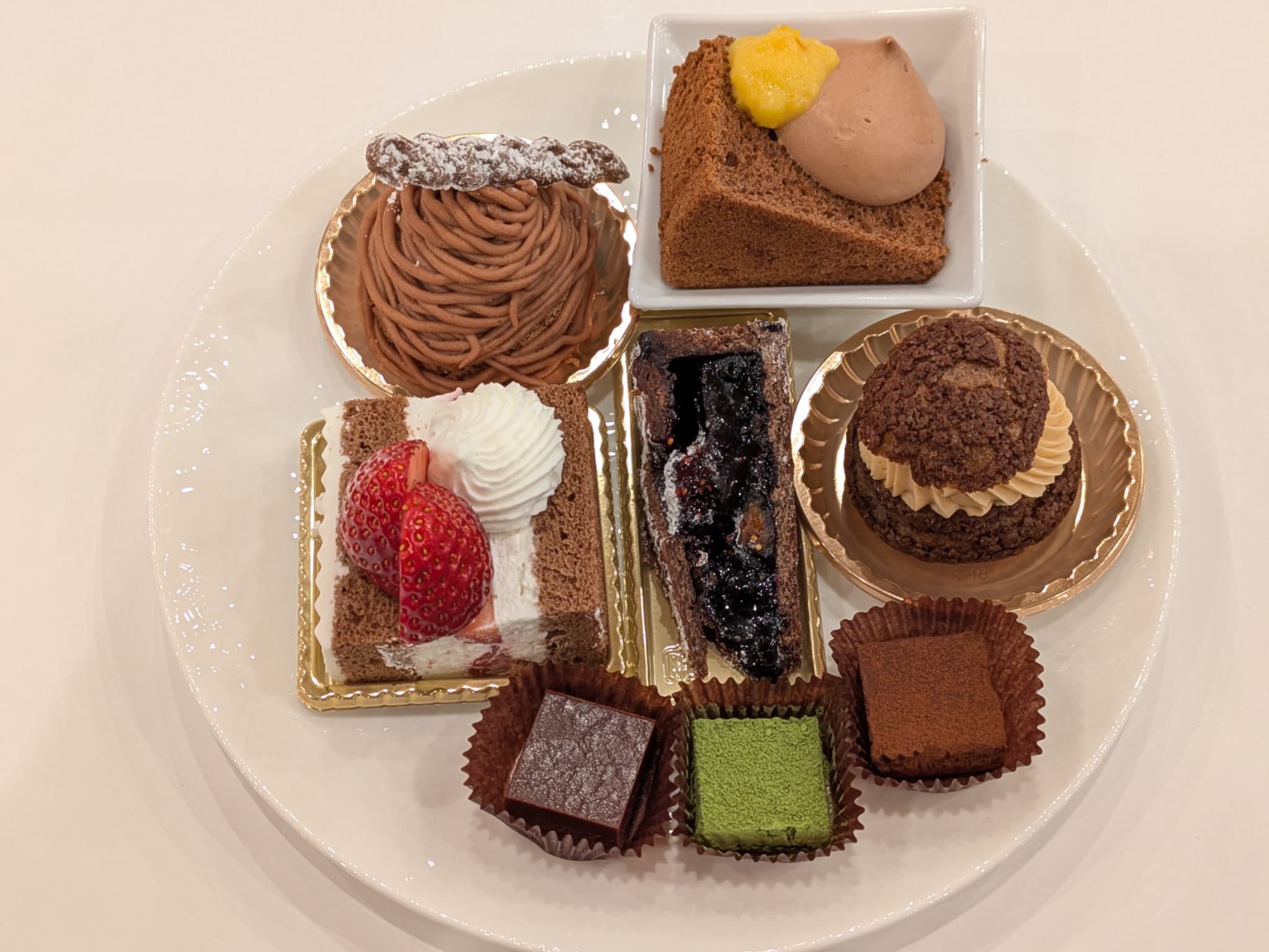 ミニサイズに切り分けられたチョコレートショートケーキ。