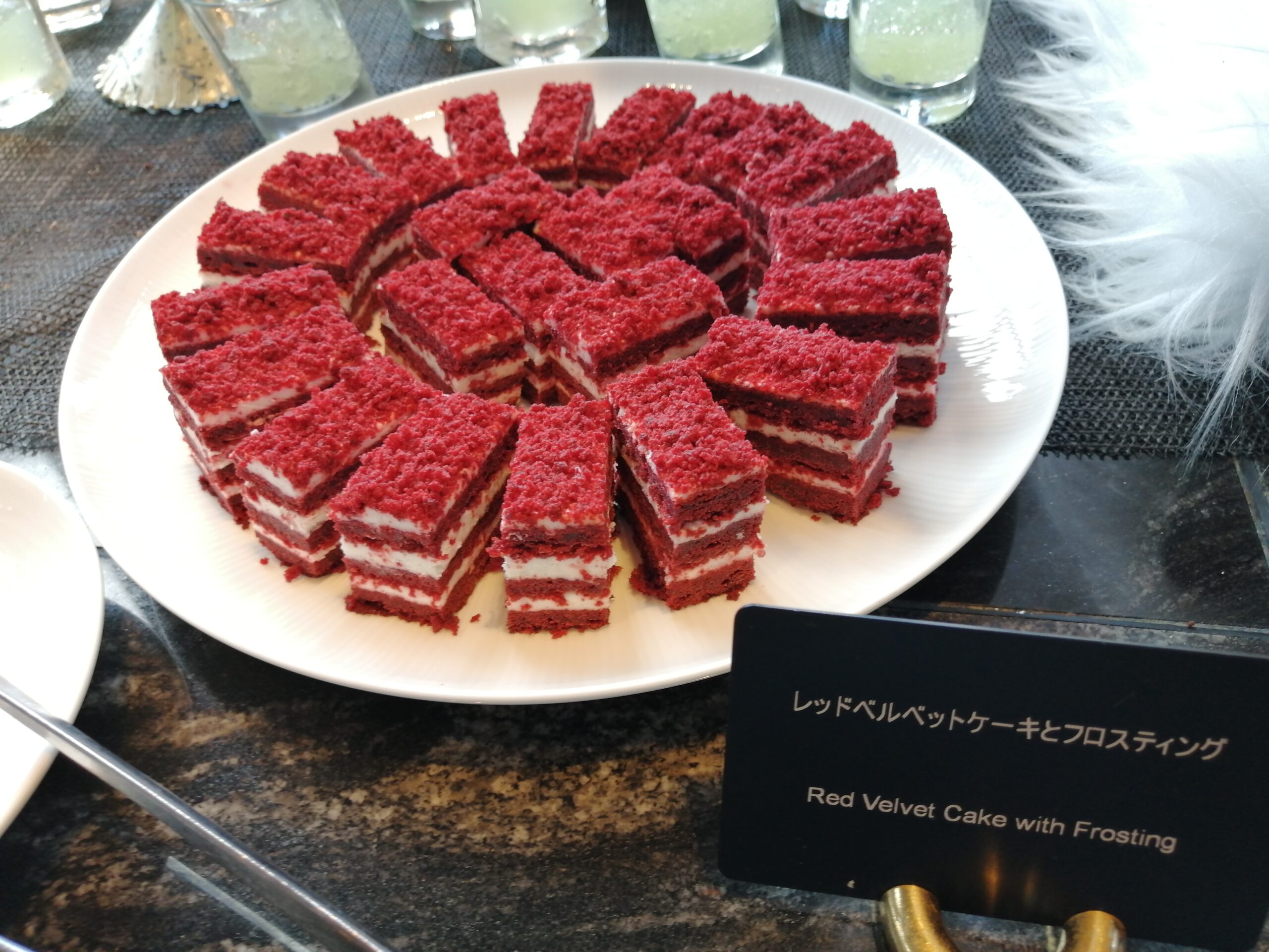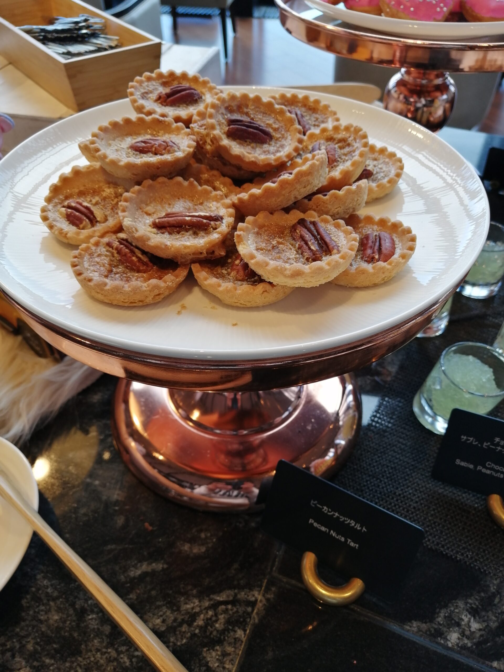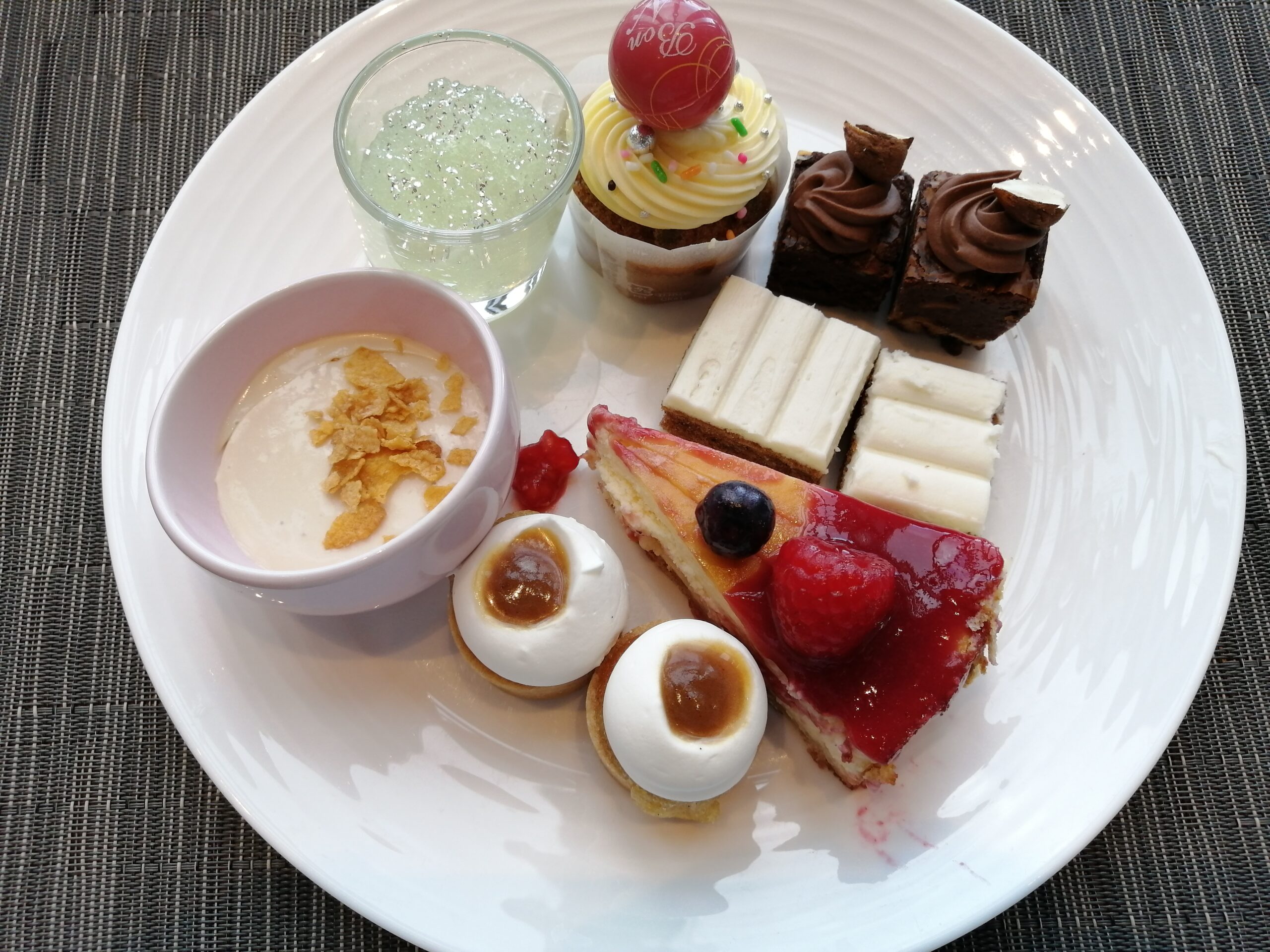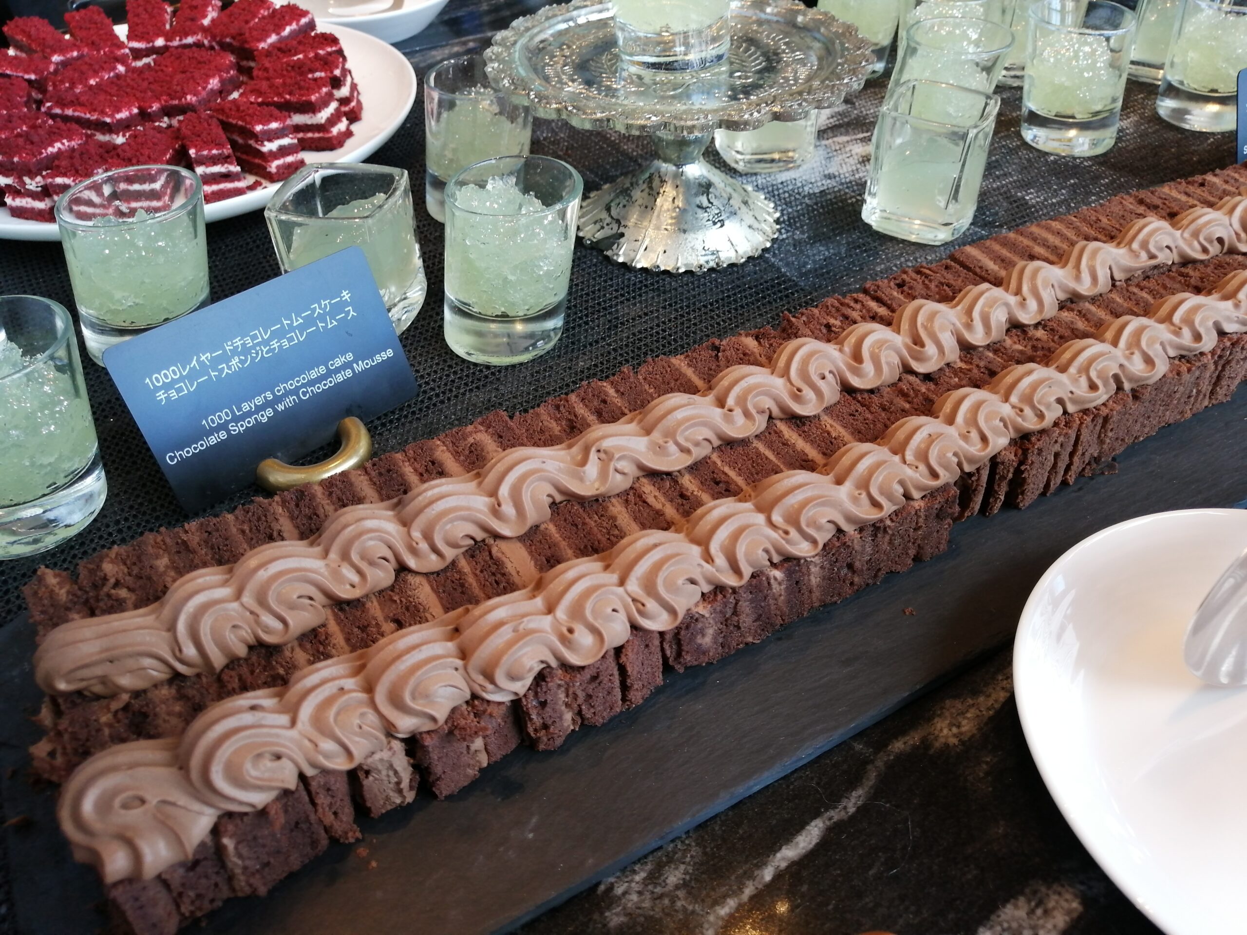 グラスとか焼き菓子なんかは余裕ありますけどホールのケーキとかは早い段階で消えちゃいますからこの辺早めに取っておく方が良さげですね。途中になるとぐちゃぐちゃになっちゃってインスタ映えとは程遠い存在に変わり果てますので…。