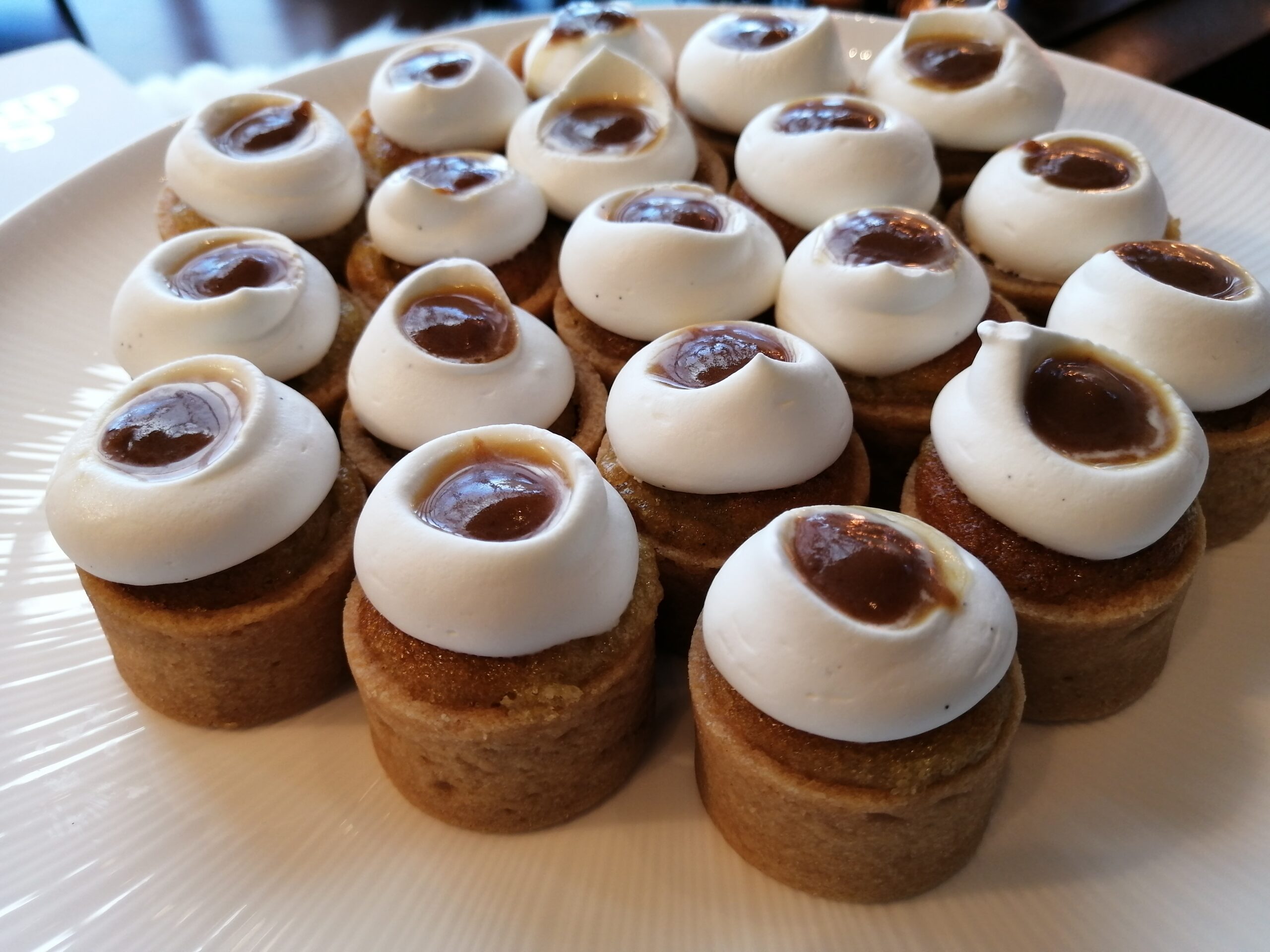 1口サイズに作られたパイなのですがトップにはほんのりと苦味を感じるキャラメルソースとあっさりとした生クリーム。