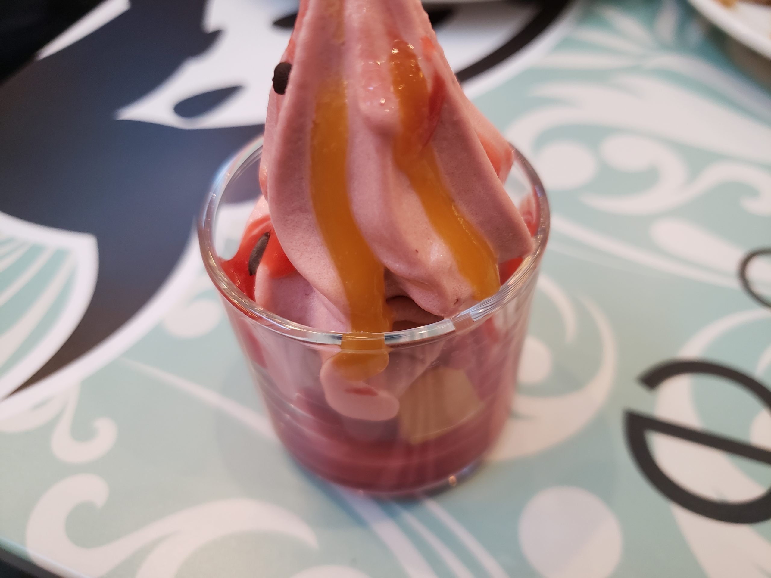 あまおう苺を使ったソフトクリームにフルーツソースが掛けられています。中には苺等が入っており、ルバーブのコンフィチュールが敷き詰められていました。最近流行りのピエールエルメの安売りです(笑)