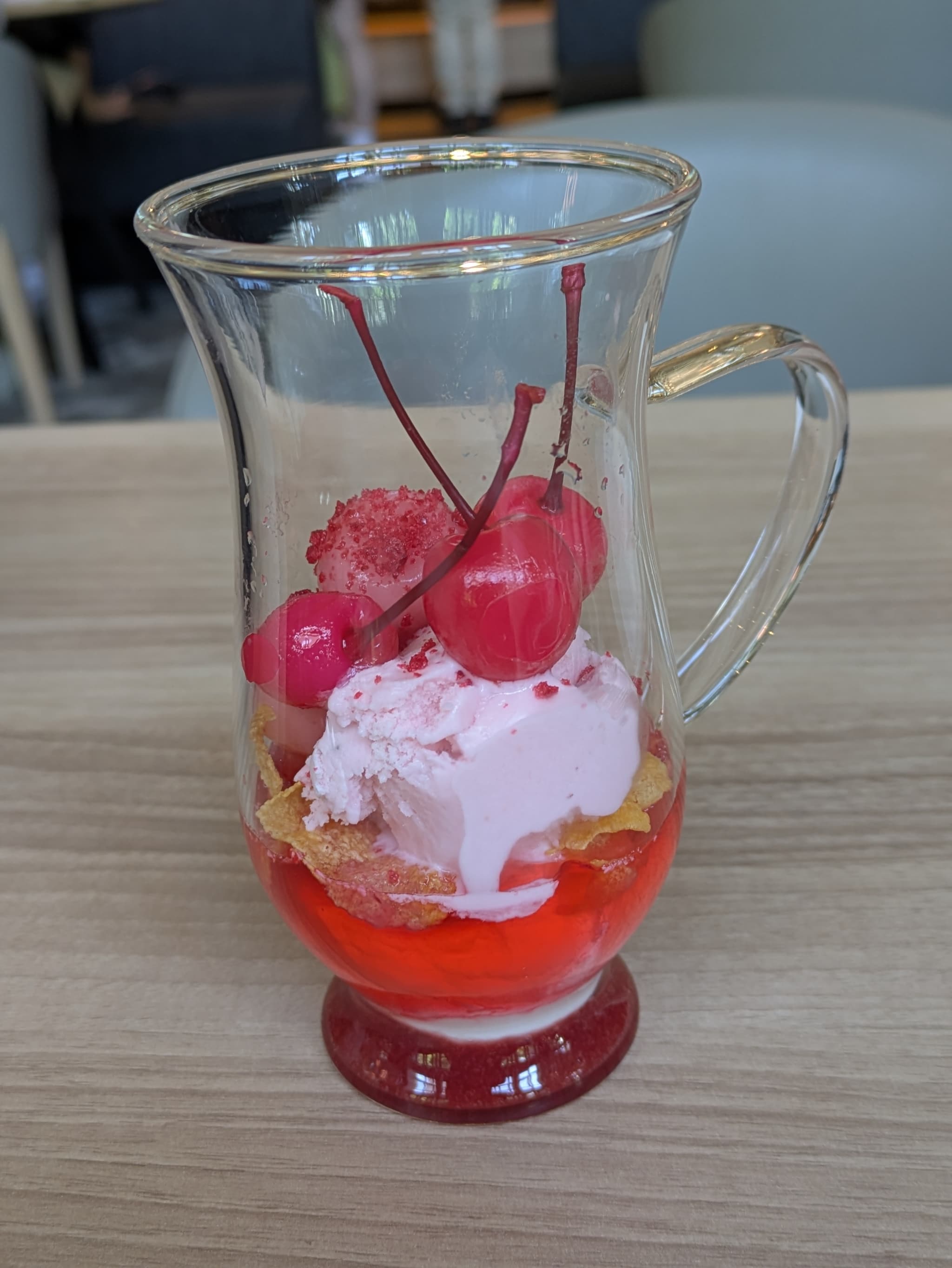 グラスの中にはアイスクリーム、コーンフレーク、苺ゼリー、シャンティクリーム。トッピングには苺ソースや苺風味の白玉なんかも自由に選べるようなのでお子様にも楽しめる感じ。