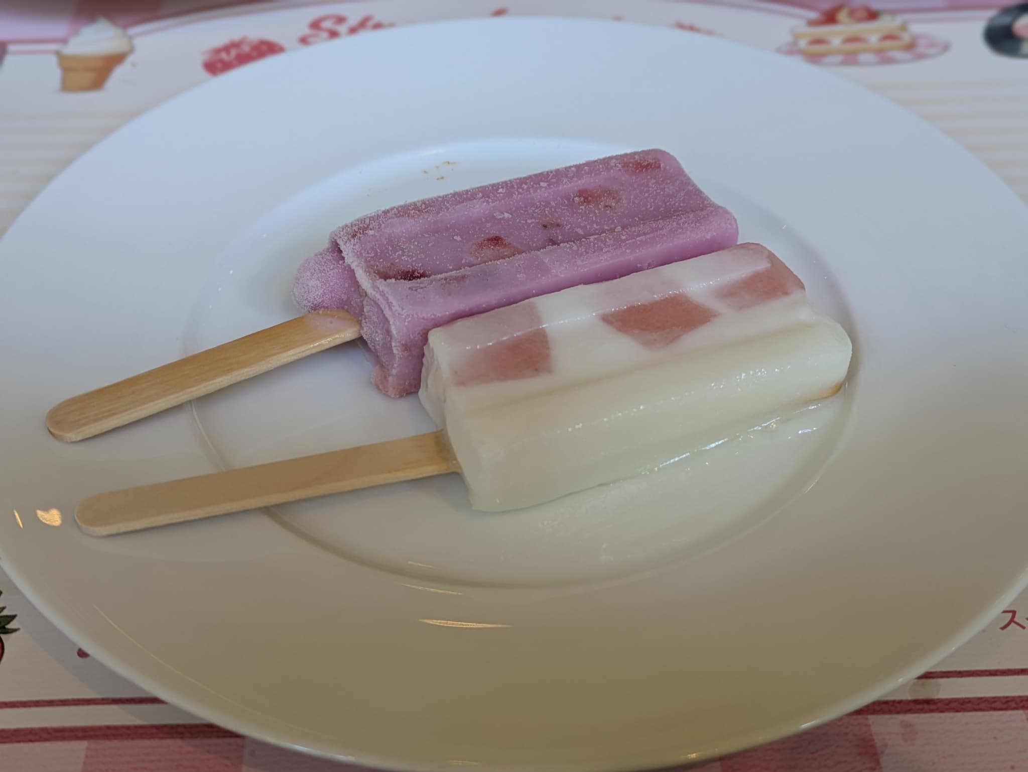 アイスキャンデーは桜ストロベリー、苺カルピスをチョイス。