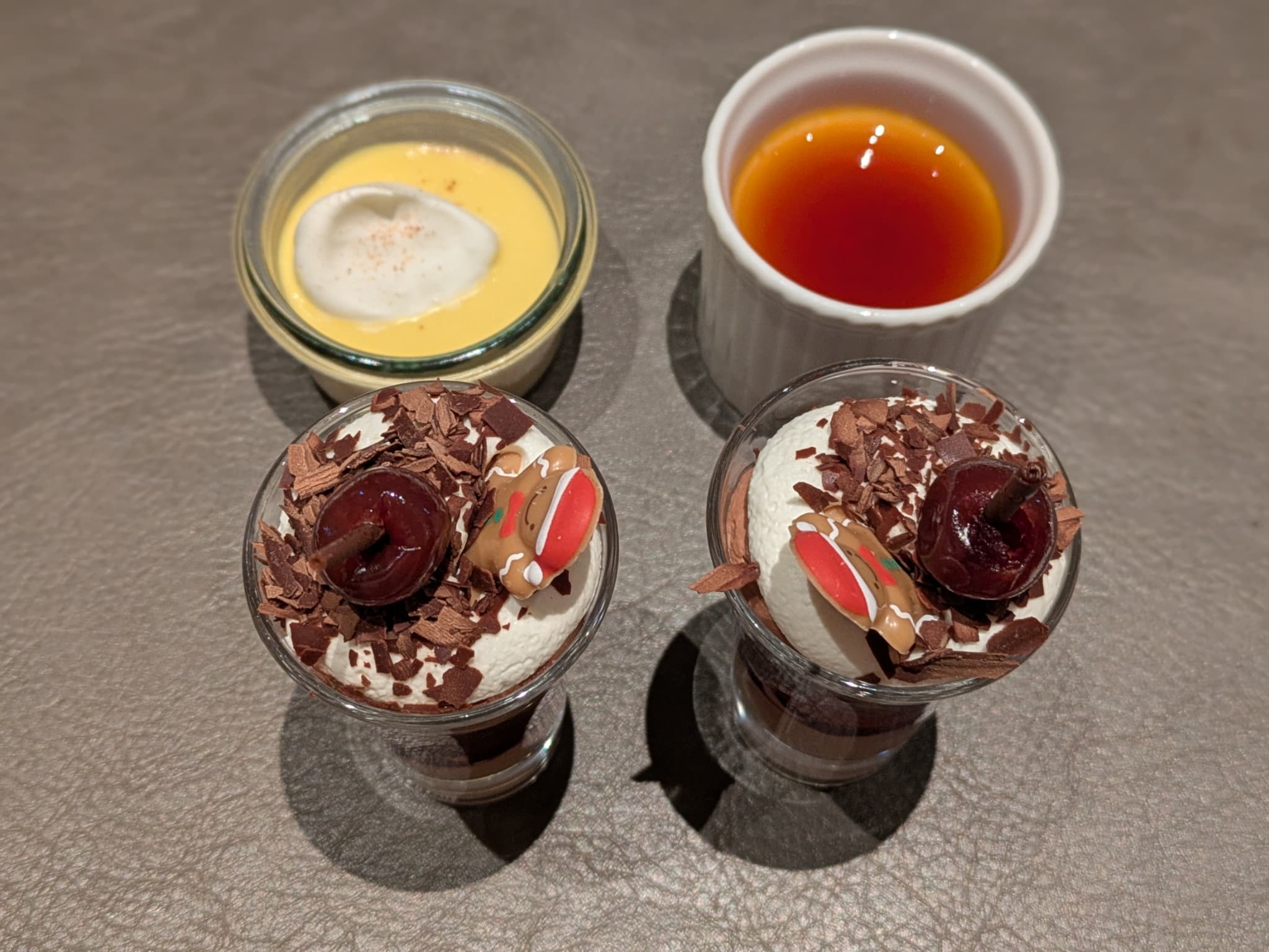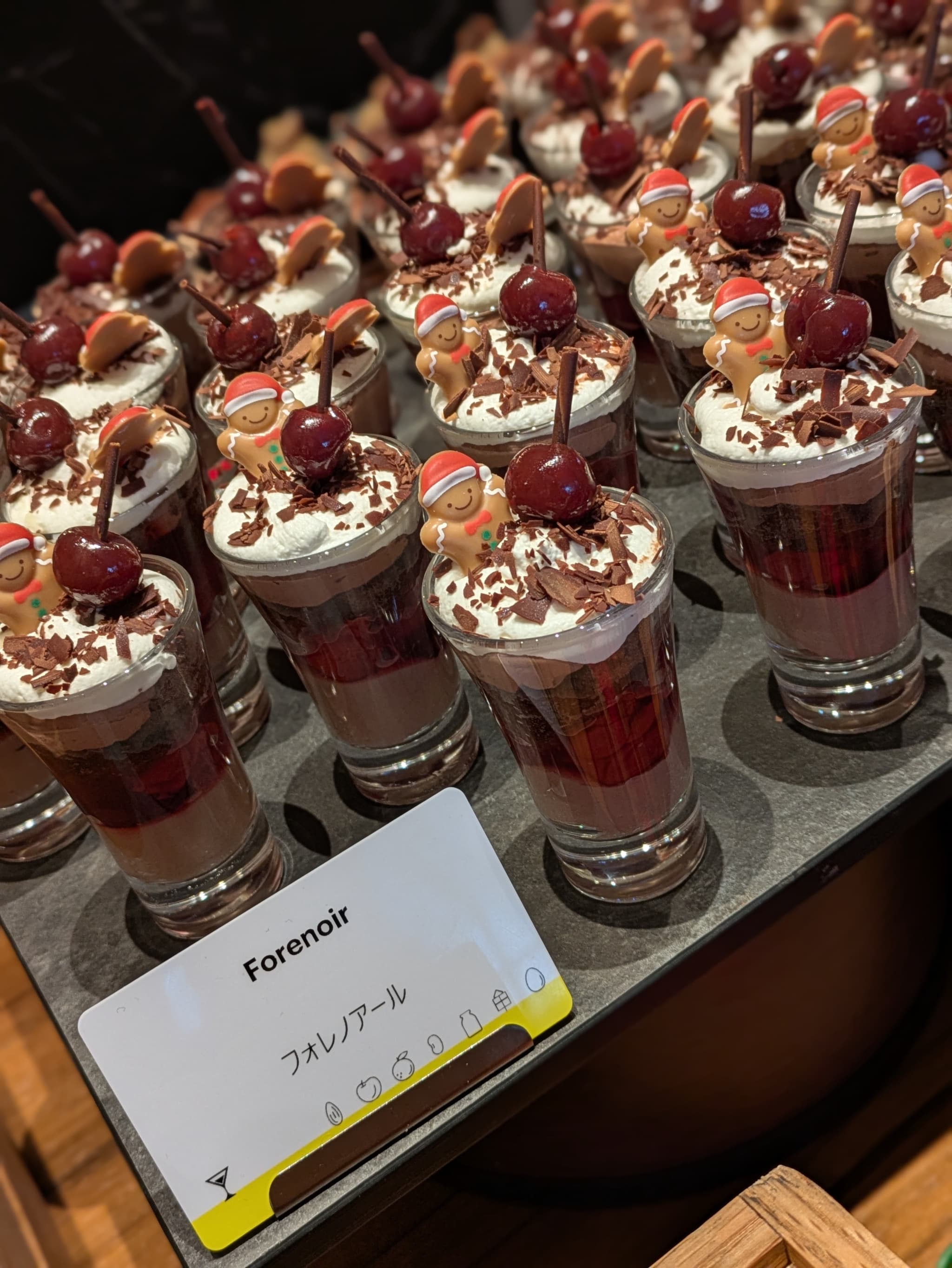 トップにはジンジャーマン型のブロンドチョコレート、チョコレートコポーを散らし、キルシュ漬けにされたグリオットチェリーがチョコレートに刺さったような見た目が特徴的。