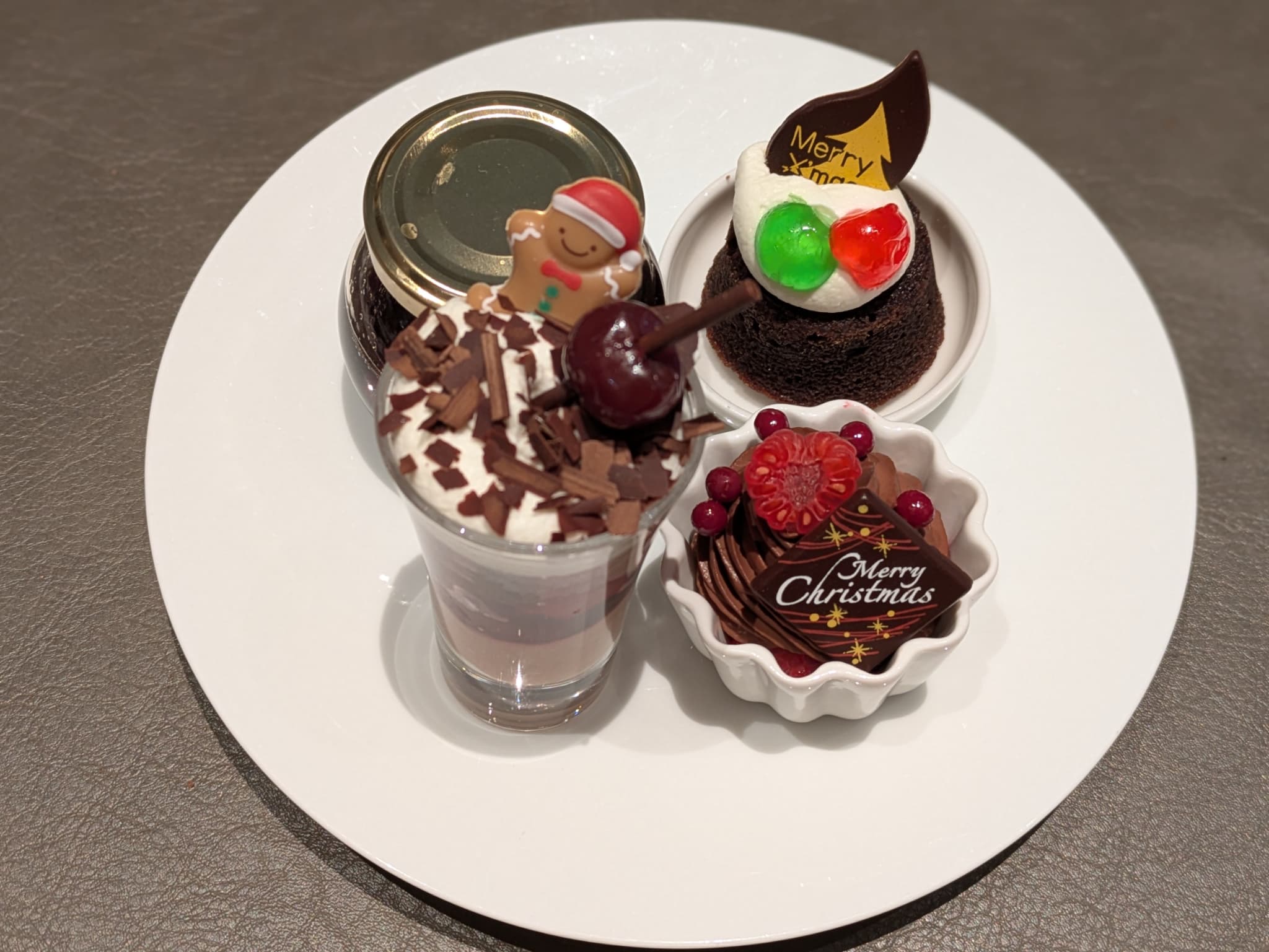 去トップにはチョコレート飾り、赤と緑のドレンチェリー、そしてシャンティクリーム。