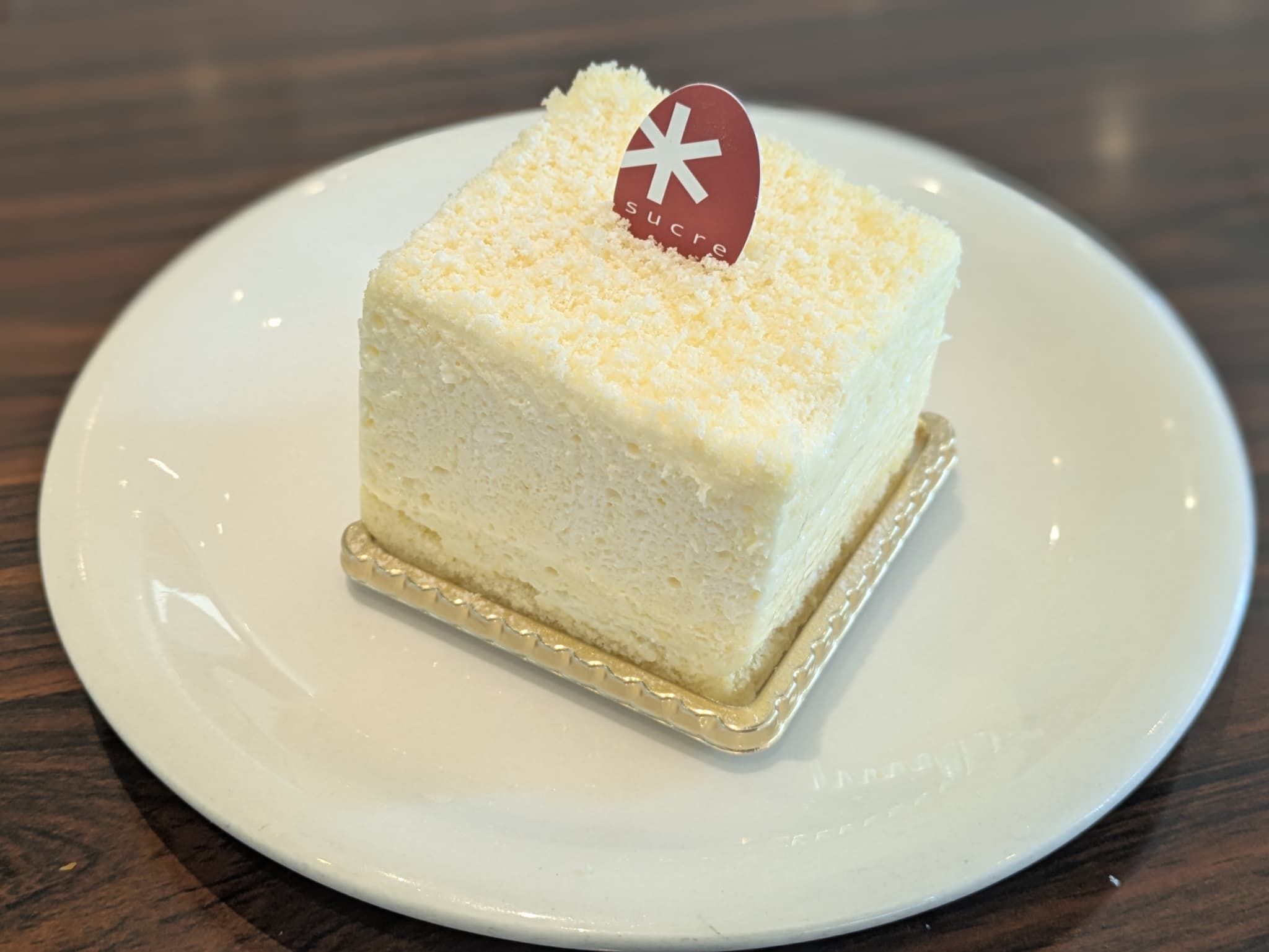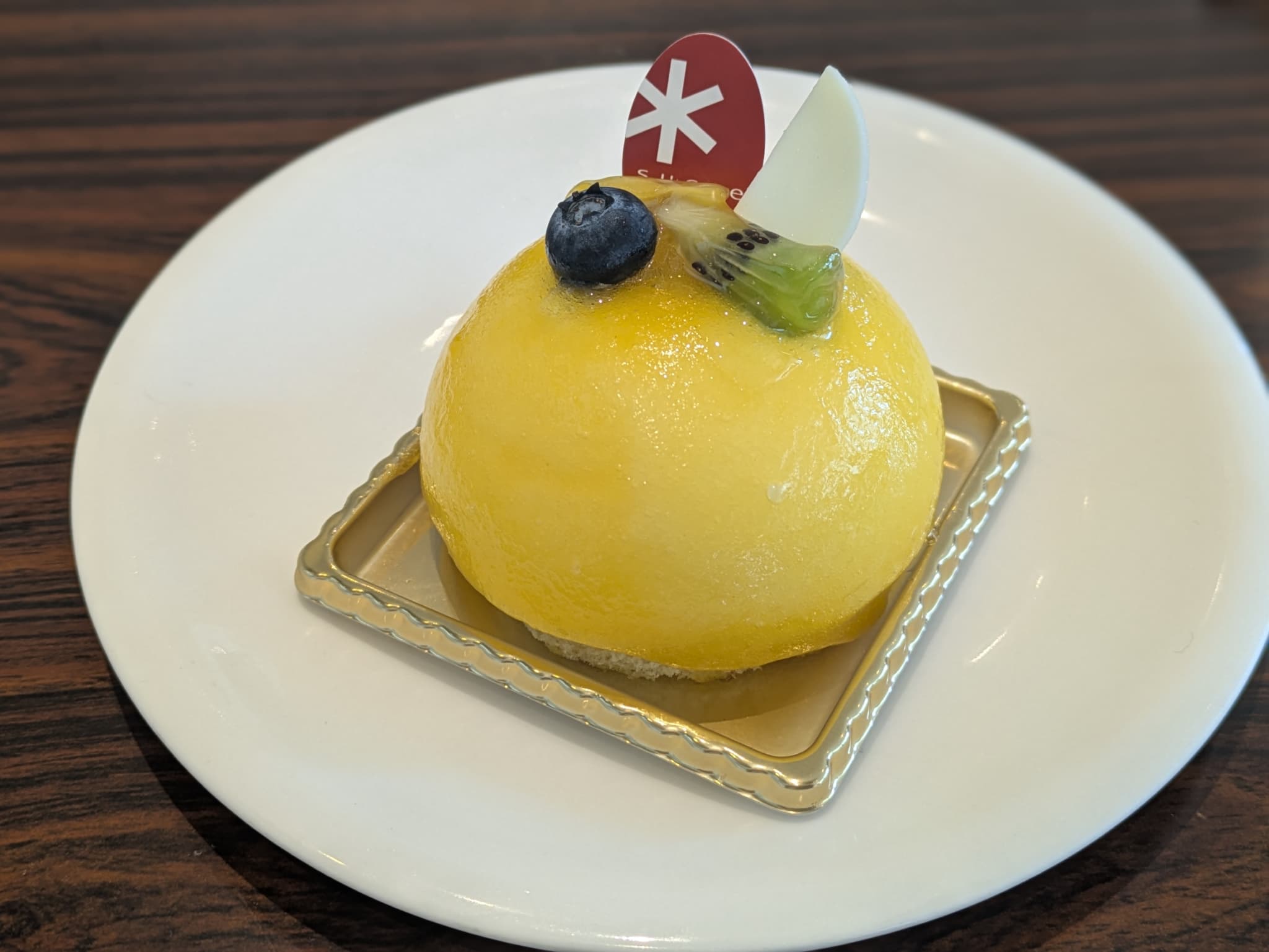 表面をナパージュでコーティングし、柔らかい食感のシナモンババロア、ジェノワーズ生地、色合いからカスタードクリームかな?と予想しましたがめちゃめちゃ酸味の強い酢橘クリームという構成。