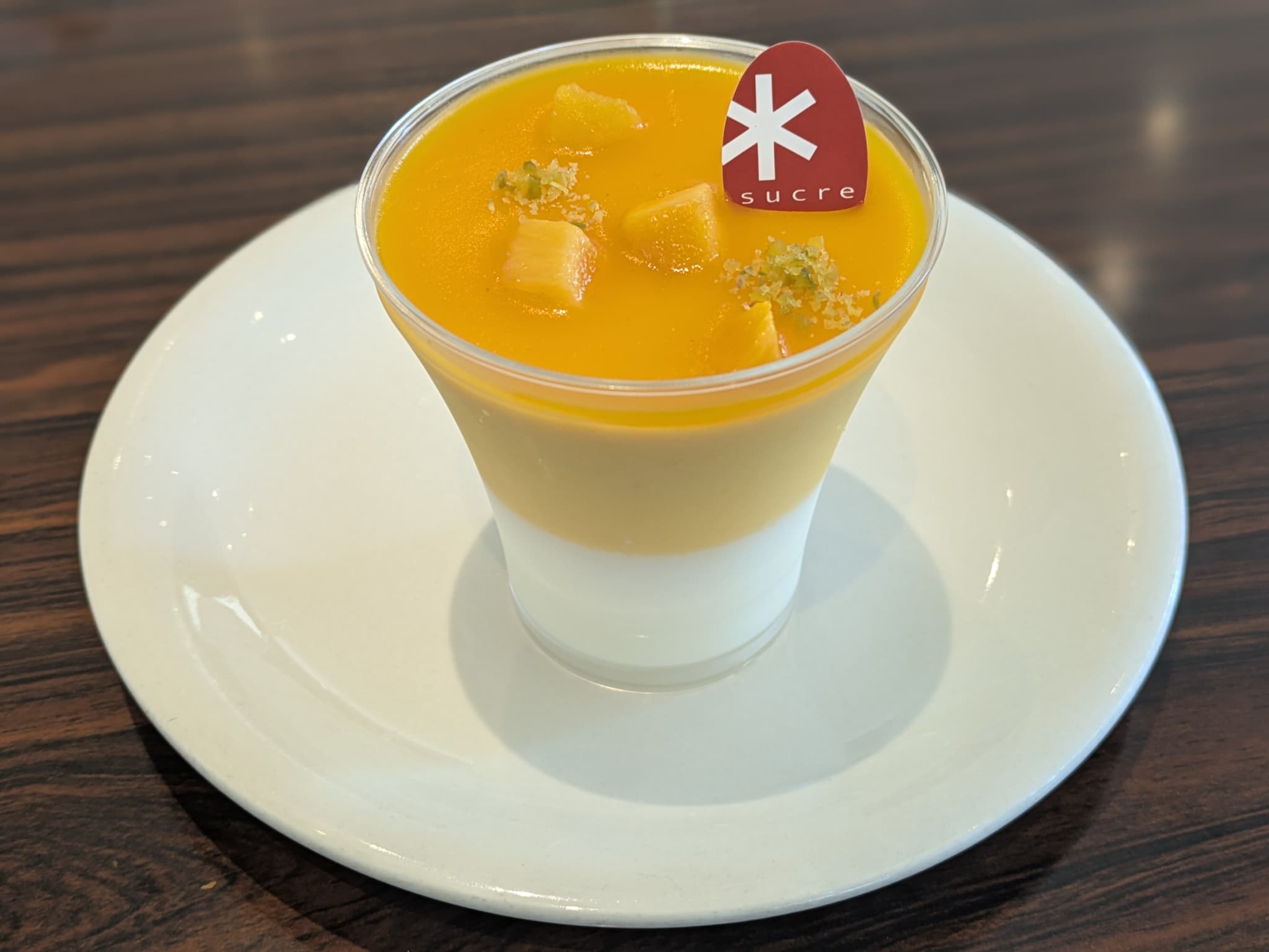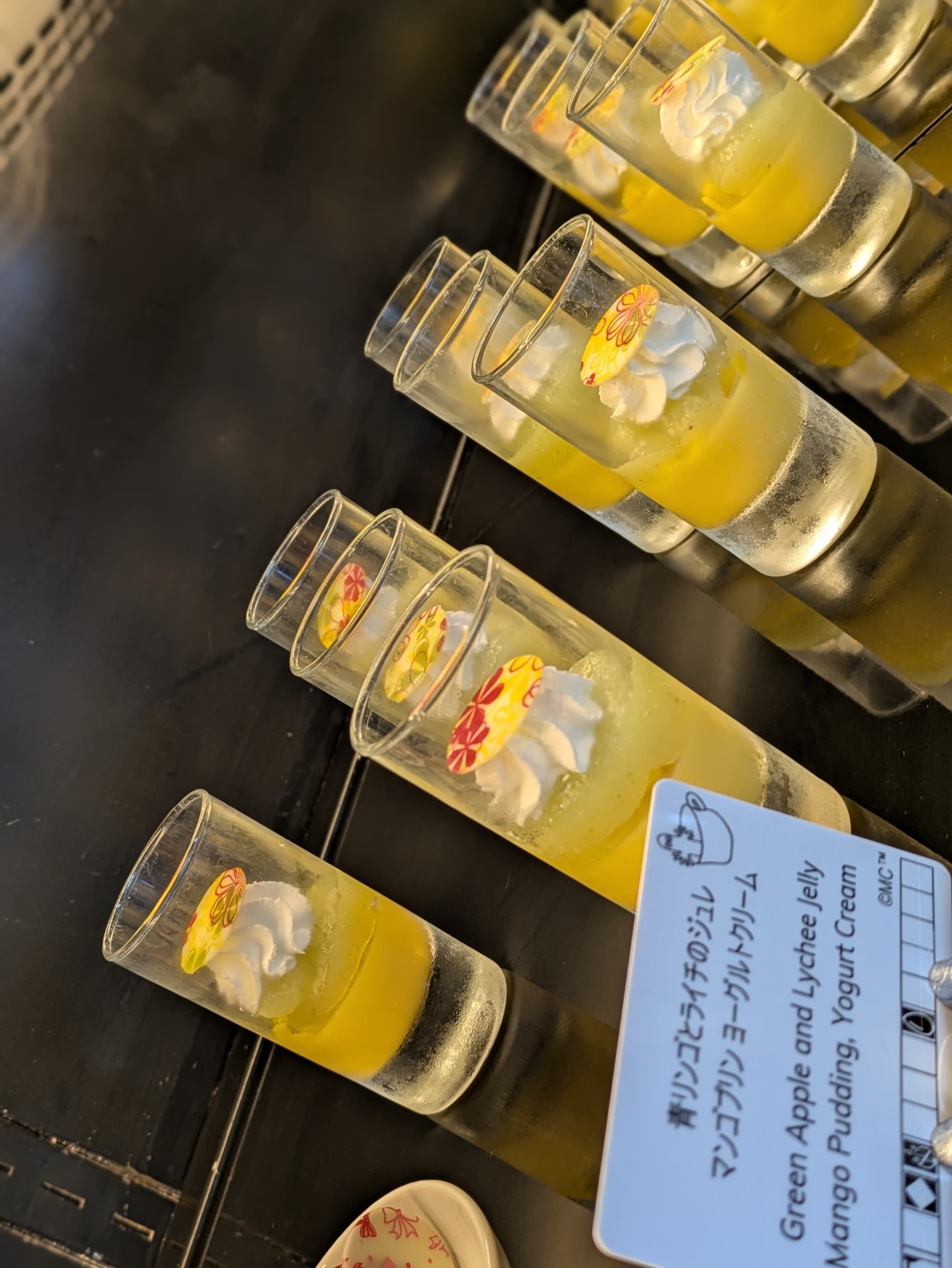トップにはチョコレートの飾り、さっぱりとしたヨーグルト風味のクリーム、青リンゴ&ライチを組み合わせた酸味のあるジュレの下にマンゴープリンというグラスデザートでした。