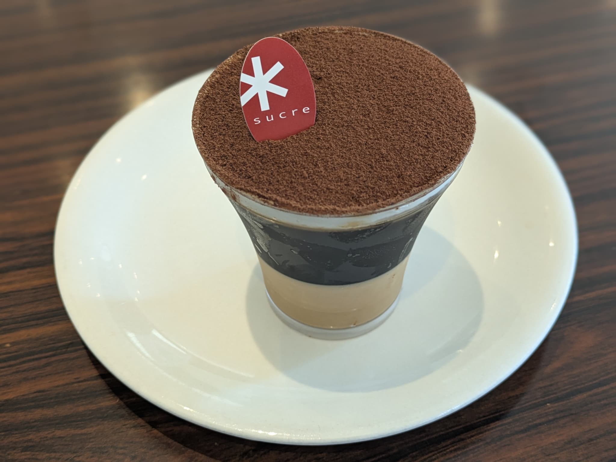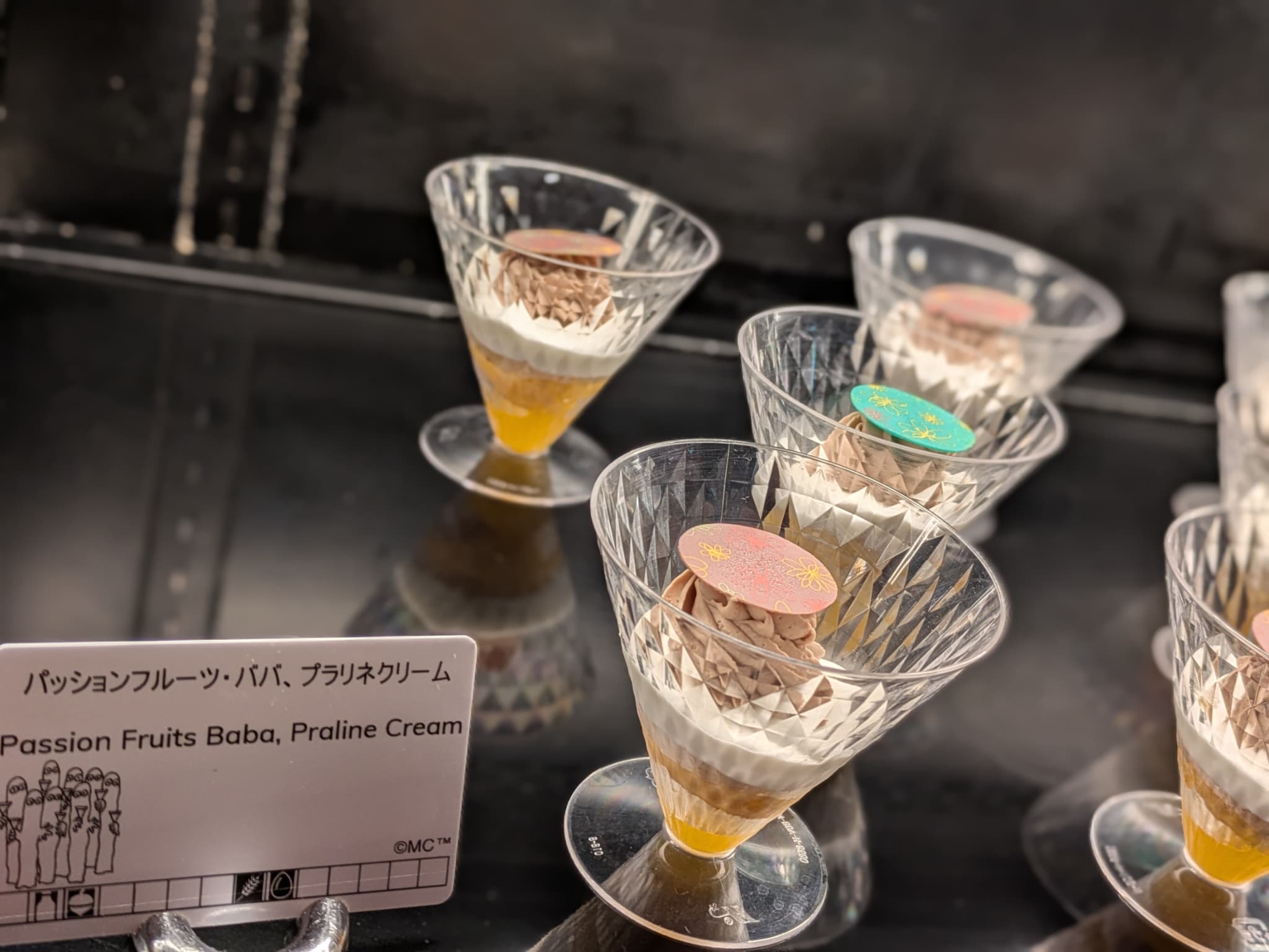 トップには薄いチョコレートが乗せられており、濃厚な甘さのプラリネクリーム、甘さ控え目のシャンティクリーム、パッションフルーツソースに浸されたババが入ったシンプルなグラス。