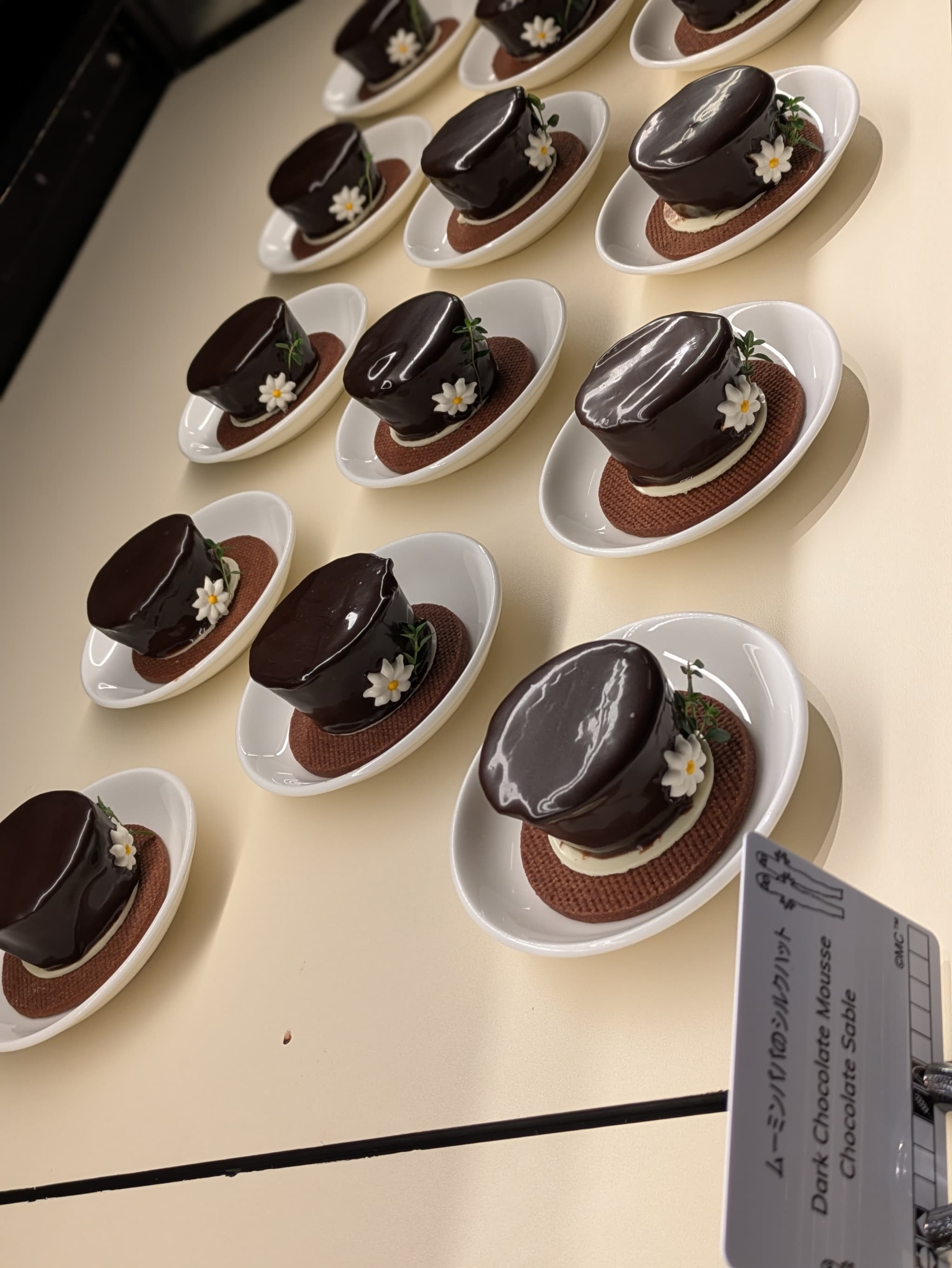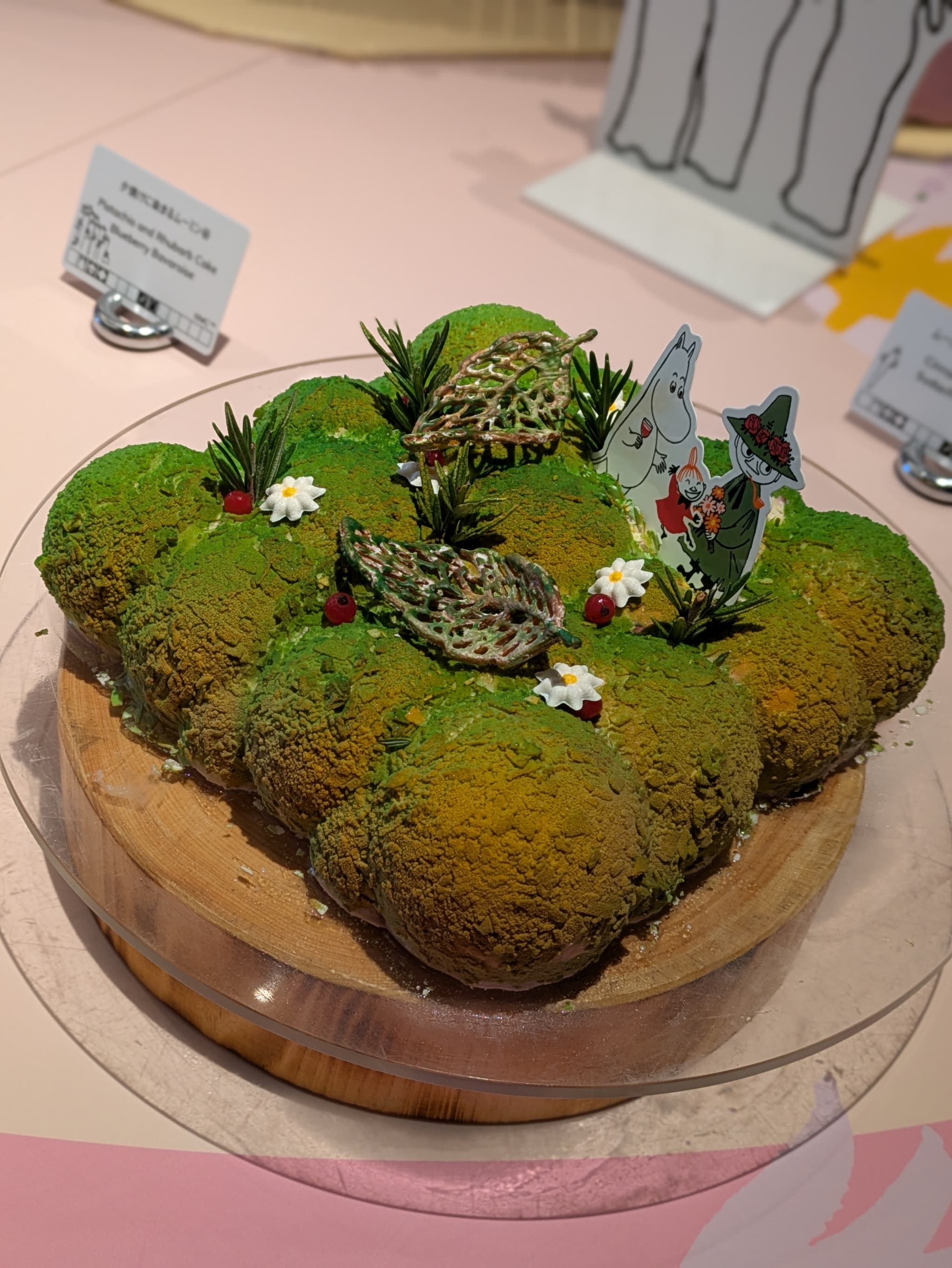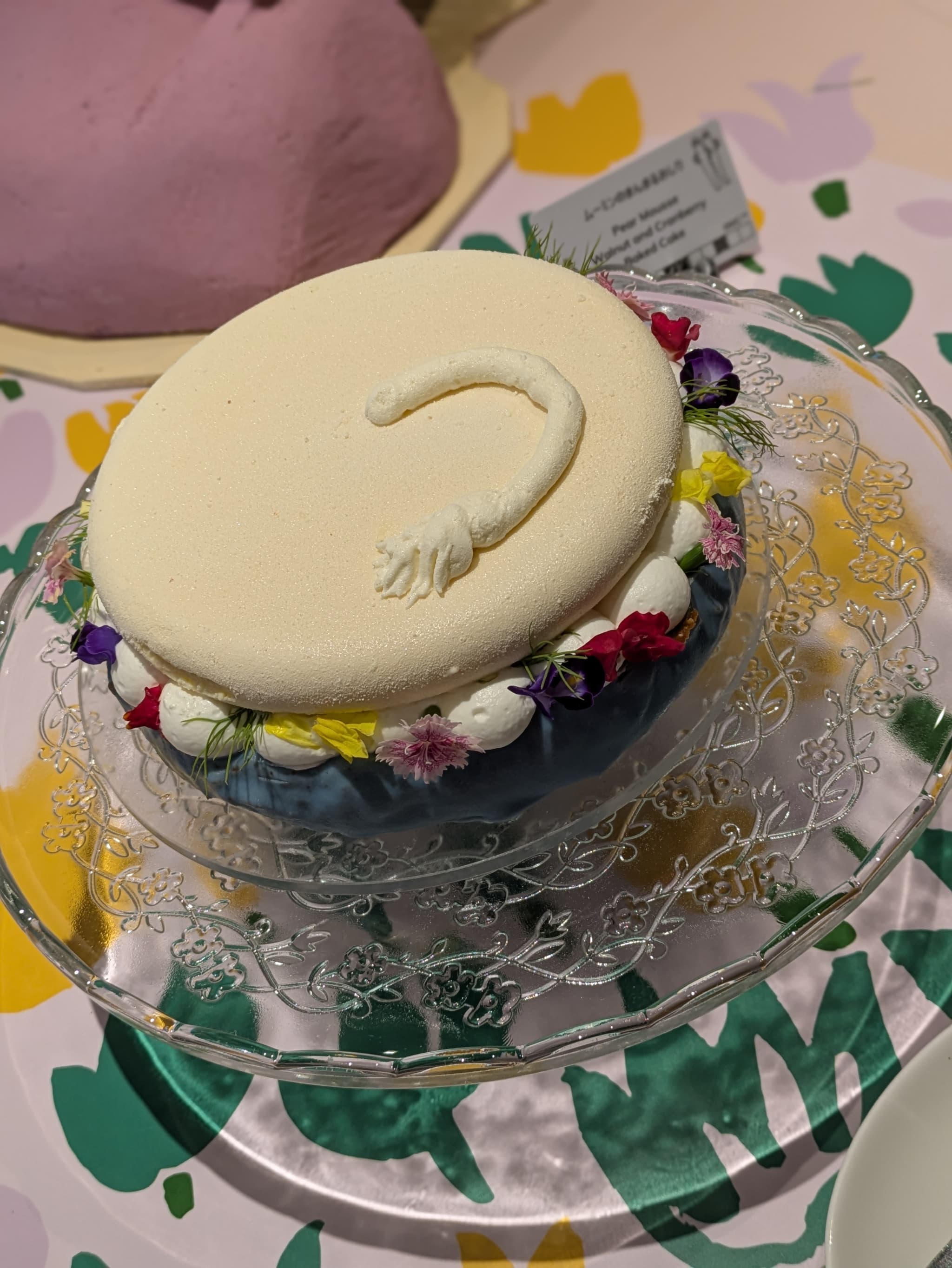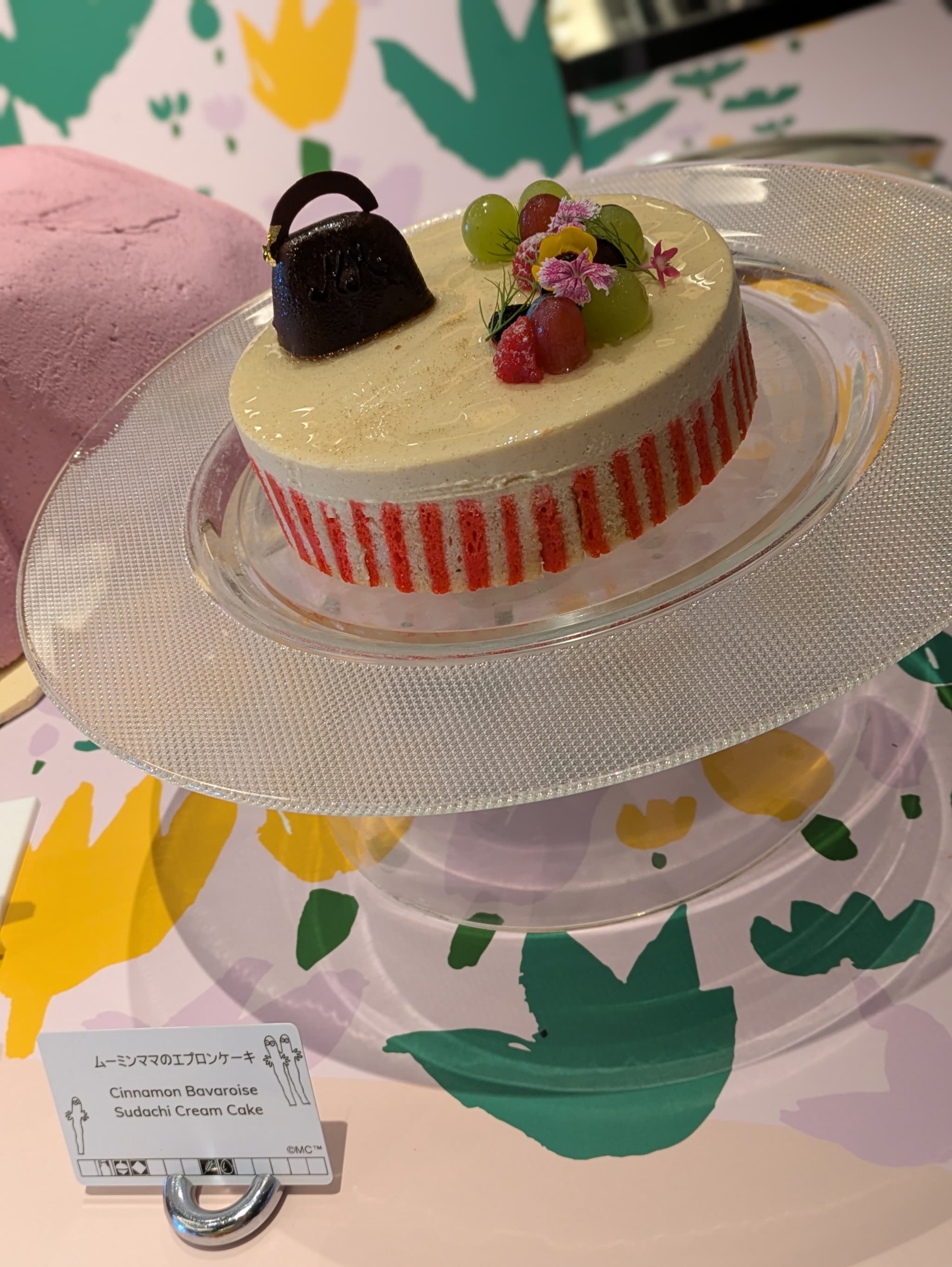 トップにはムーミンの可愛いお尻と尻尾をイメージした真っ白な洋梨風味のムース、お花畑のようなエディブルフラワーで側面をデコ🌼