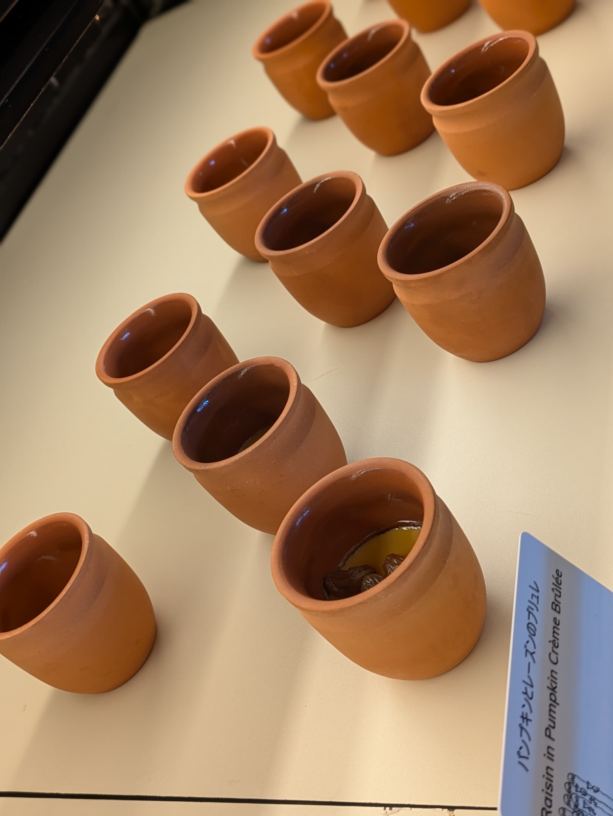 食感のあるレーズン、苦味のあるカラメルソースの下にしっかりとした食感のかぼちゃ風味のブリュレ。