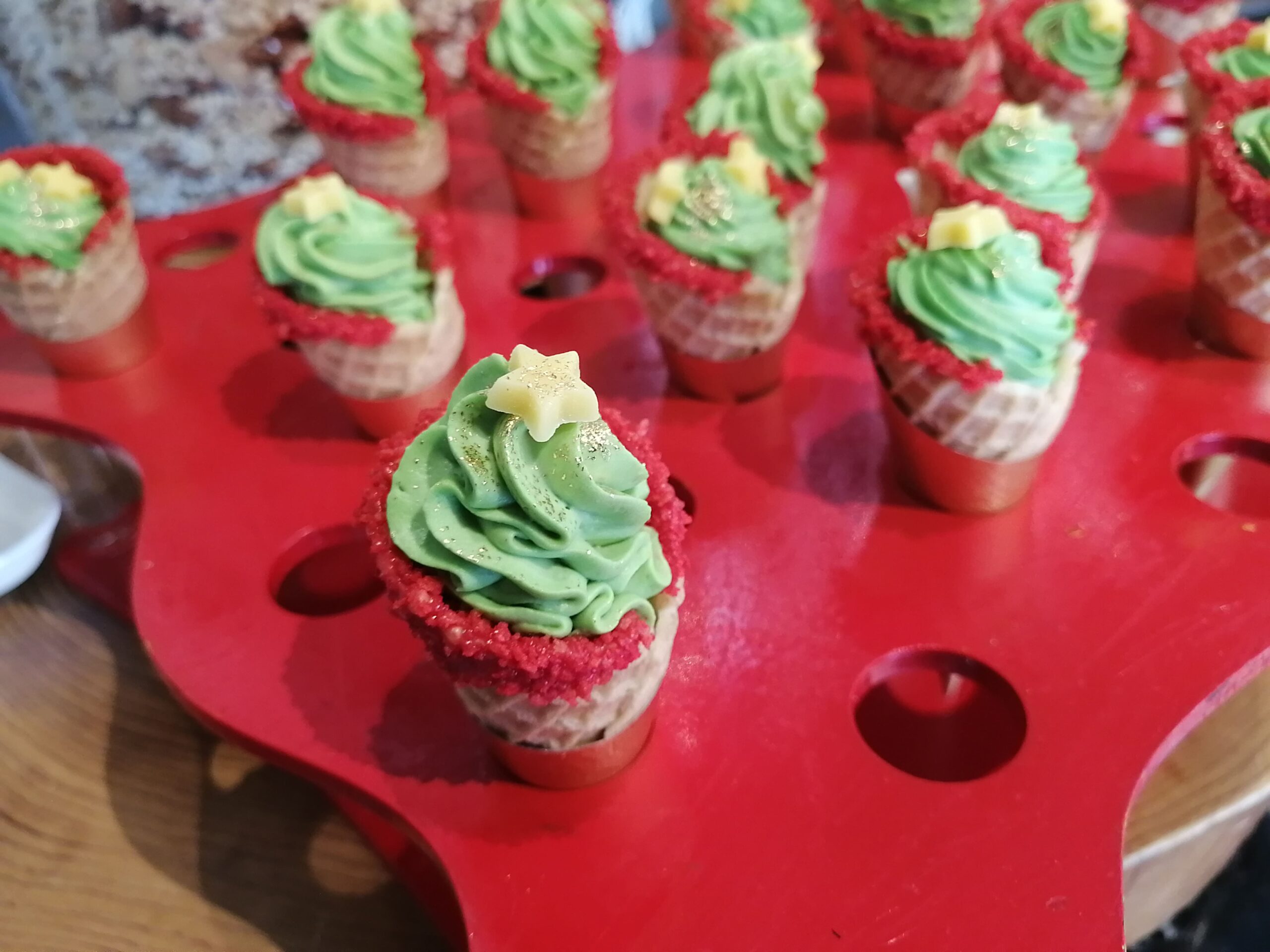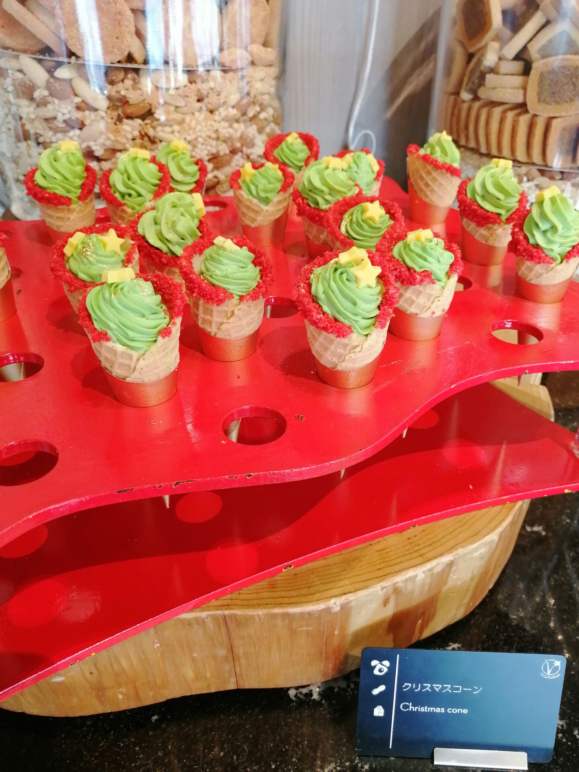 ワッフルコーンで作られたメニュー。クリスマス仕様になっていますね。